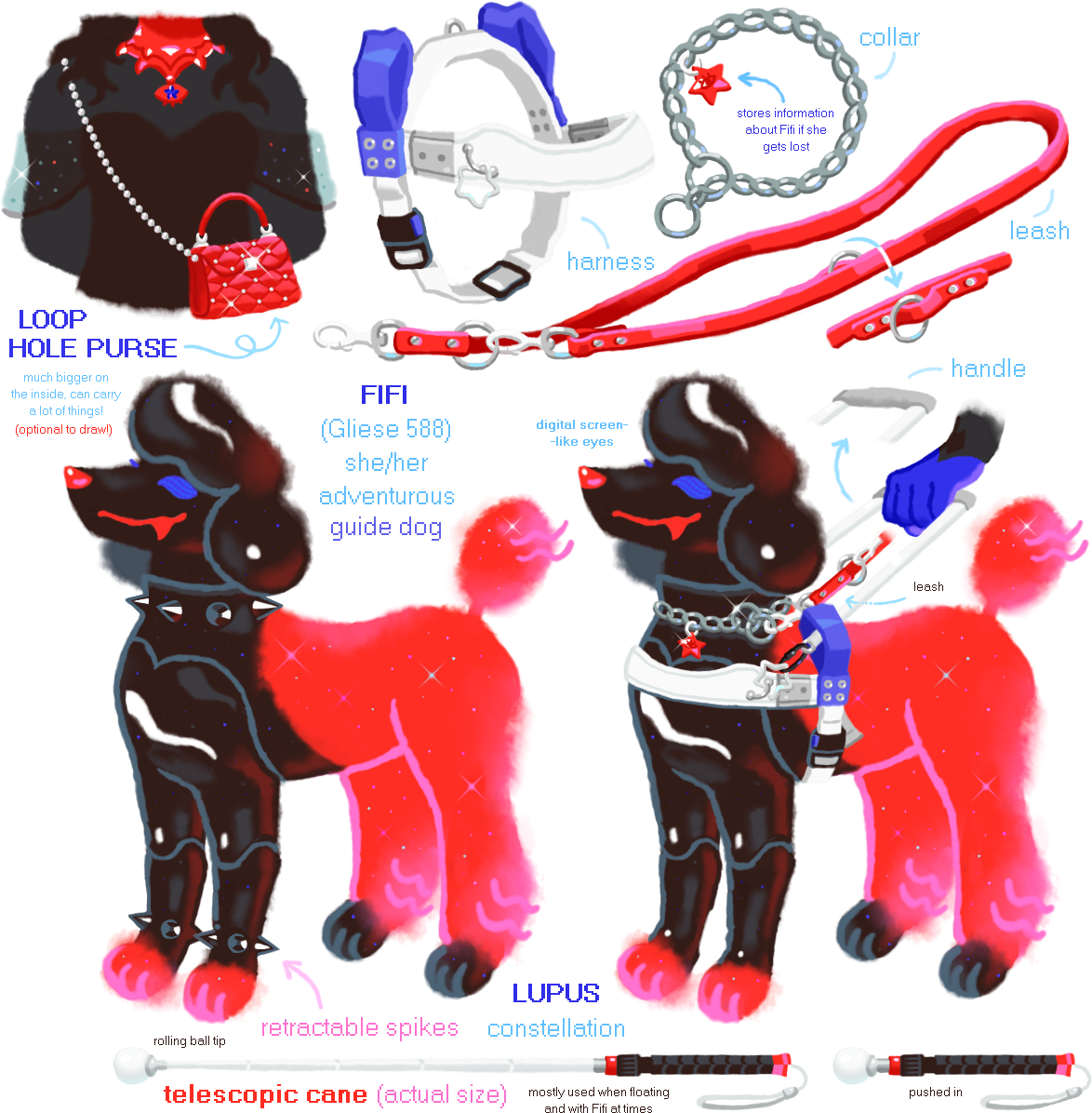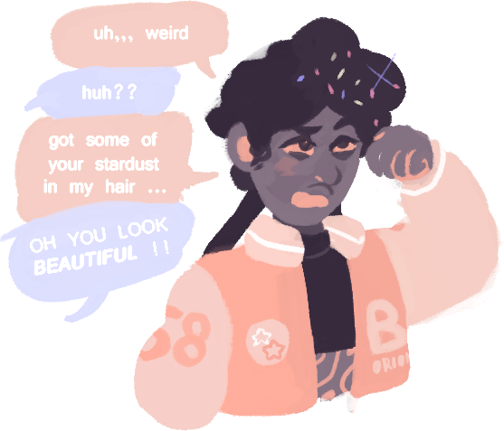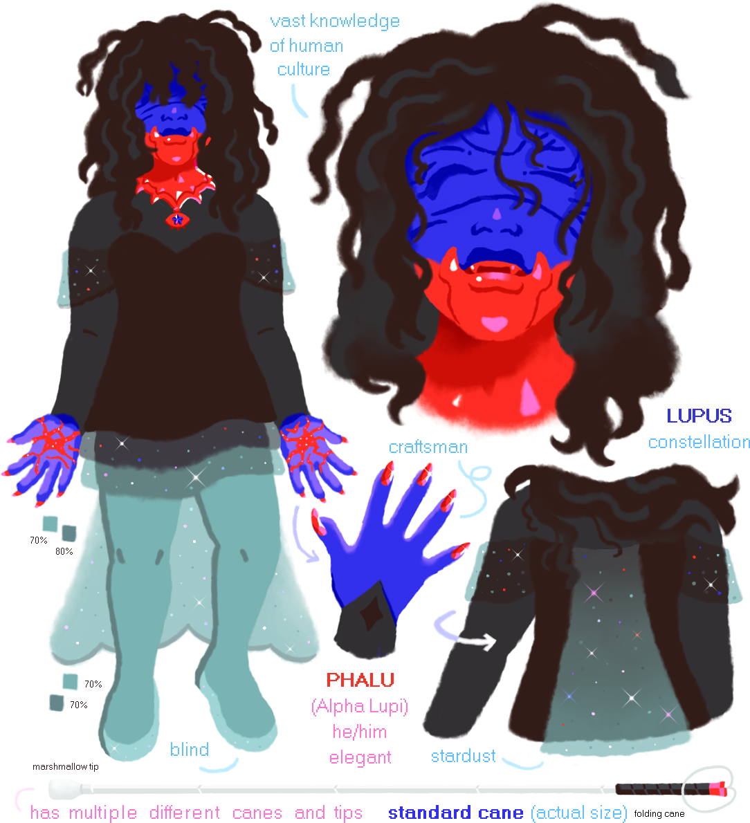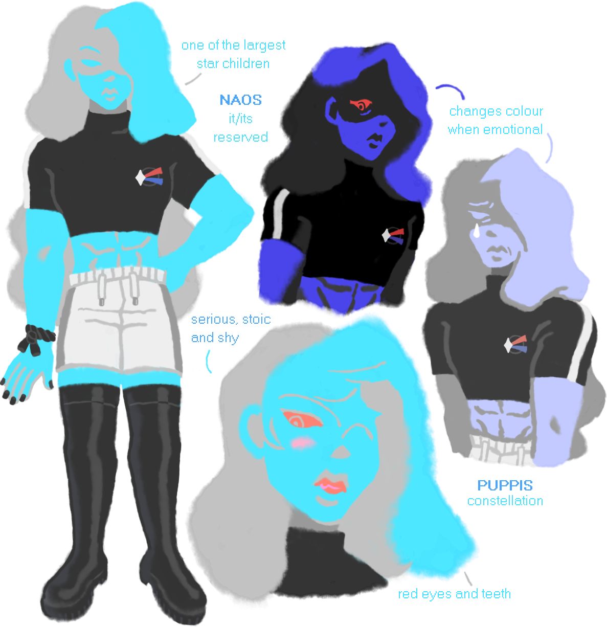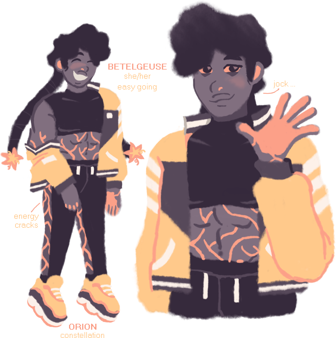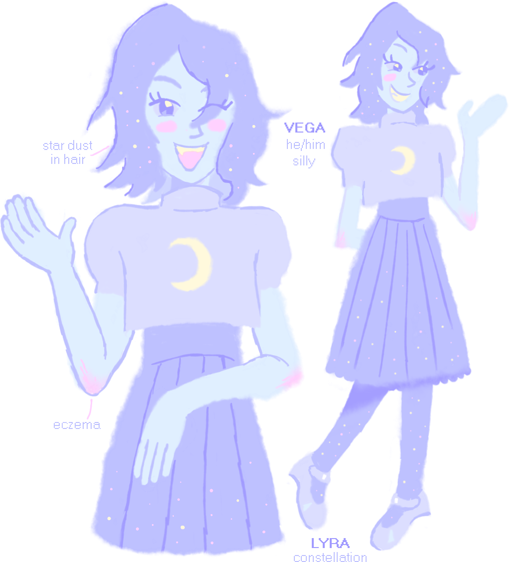 I don't remember when and why I made Vega and Betelgeuse, but they ended up being two of my most cherished characters. I made them out to be best friends immediately. They both have a lot on their plate and both deal with a lot of external problems. But around each others they can be as goofy as they want without worrying about what others think. Character 1 & 2 redesigned out of ~26!Below is an old drawing of Betelgeuse with Vegas star dust.