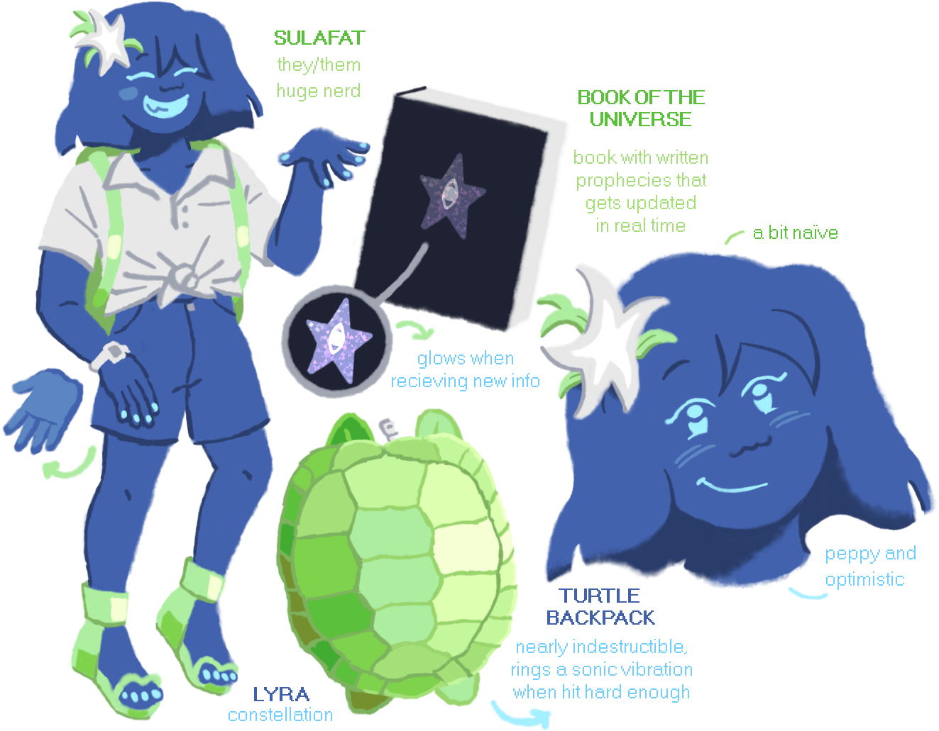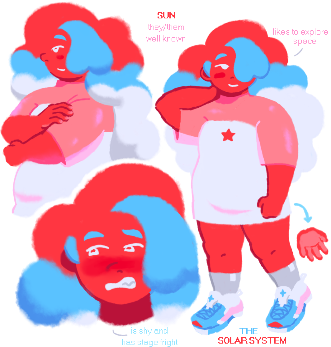 Sun and Sulafat were some of the very first star children I made, which makes them two of the most developed ones. I don't like picking favorites but they are very much up there!! I've definitely given Sulafat extra attention, especially since they were the first one to have finished artifacts (all of them are supposed to have some) Character 5 & 6 redesigned out of ~26!Below is the first drawing of Sun, who started out as a simple colour test.