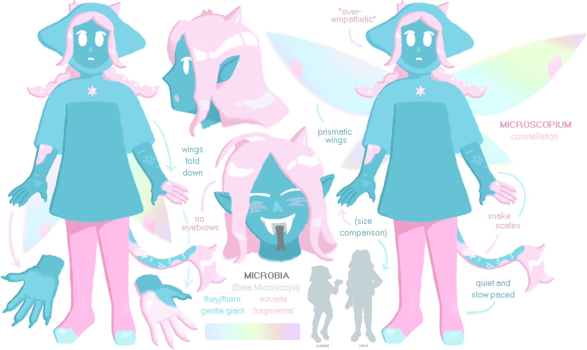 Microbia is the first novaite I designed. A novaite is a sub-category for star children. Novaites are fused with much more star energy, they become giants in the process and can even size-shift, becoming even bigger at will. But Microbia is also a fragmental, which is a soul bonded with scraps of other souls, resulting in changed physical features and memories the original souls didn't have. Microbia is lore heavy lol... Character 9 redesigned out of ~26!